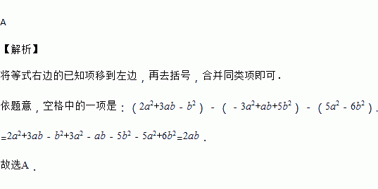 某天数学课上老师讲了整式的加减运算,小颖回到家后拿出自己的课堂笔记,认真地复习老师在课堂上所讲的内容,她突然发现一道题目:(2a2+3ab-b2)-(-3a2+ab+5b2)=5a2