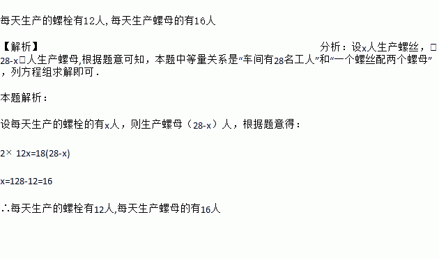 每天生产的螺栓有12人,每天生产螺母的有16人 【解析】分析:设x人生产螺丝,(28-x)人生产螺母,根据题意可知,本题中等量关系是“车间有28名工人”和“一个螺丝配两个螺母”,列方程组求解即可. 本题解析: 设每天生产的螺栓的有x人,则生产螺母(28-x)人,根据题意得: 212x=18(28-x) x=128-12=16 ∴每天生产的螺栓有12人,每天生产螺...