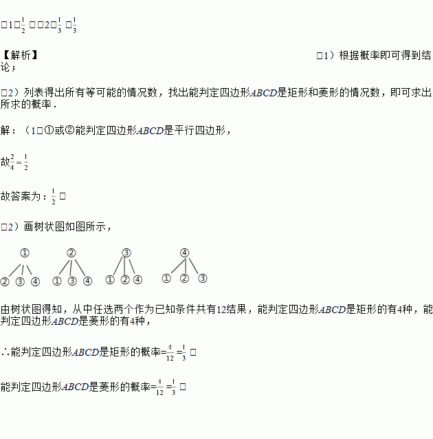 (2)从中任选两个作为已知条件,请用画树状图或列表的方法表示能判定四边形ABCD是矩形的概率,并判断四边形ABCD是菱形的概率?