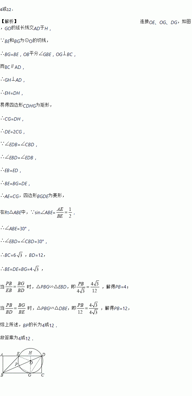 如图,矩形ABCD的一边BC与⊙O相切于G,DC=6,且对角线BD经过圆心O,AD交⊙O于点E,连接BE,BE恰好是⊙O的切线,已知点P在对角线BD上运动,若以B、P、G三点构成的三角形与△BED相似,则BP=______.