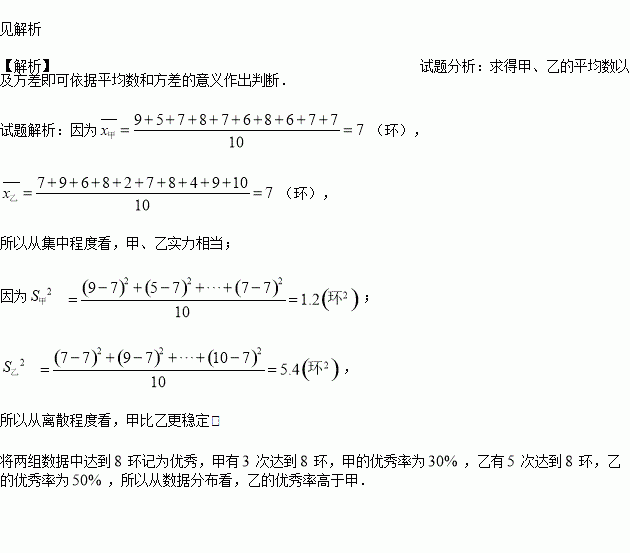 请你运用所学的统计知识做出分析,从三个不同角度评价甲、乙两人的打靶成绩.