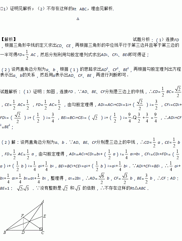 (2)是否存在这样的Rt△ABC,使得它三边上的中线AD、BE、CF的长恰好是一组勾股数?请说明理由.(提示:满足关系a2+b2=c2的3个正整数a、b、c称为勾股数.)