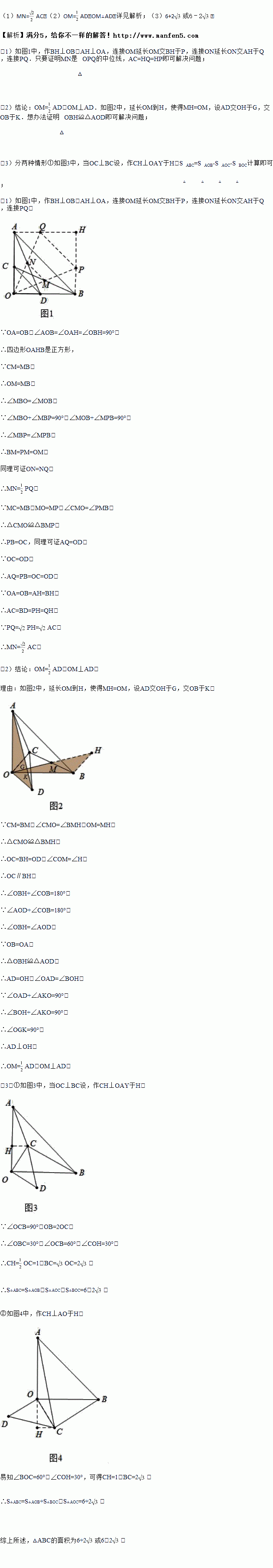 (1)若O、C、A在一条直线上,连AD、BC,分别取AD、BC的中点M、N如图(1),求出线段MN、AC之间的数量关系;