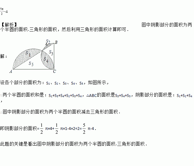 如图,在Rt△ABC中,∠ACB=90°,AC=4,BC=2.分别以AC,BC为直径画半圆,则图中阴影部分的面积为________.(结果保留π)