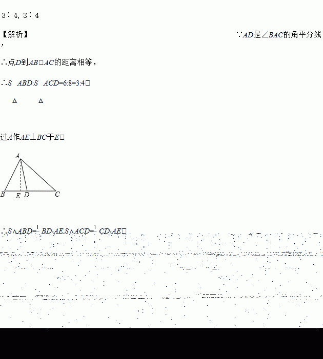 如图,在△ABC中,AD是∠BAC的角平分线,AB=6 cm,AC=8 cm,则S△ABD∶S△ACD= ____________,BD∶CD= _______.