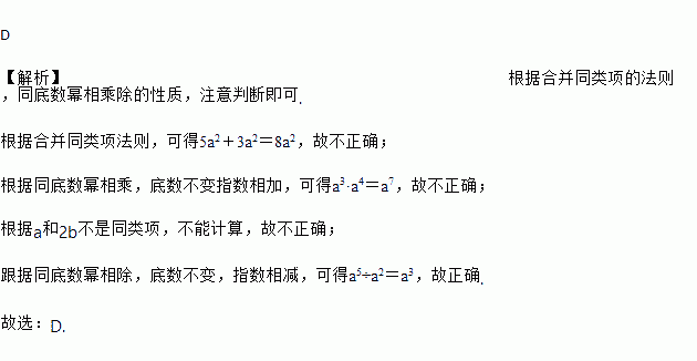 A. 5a2+3a2=8a4 B. a3·a4=a12 C. a+2b=2ab D. a5÷a2=a3