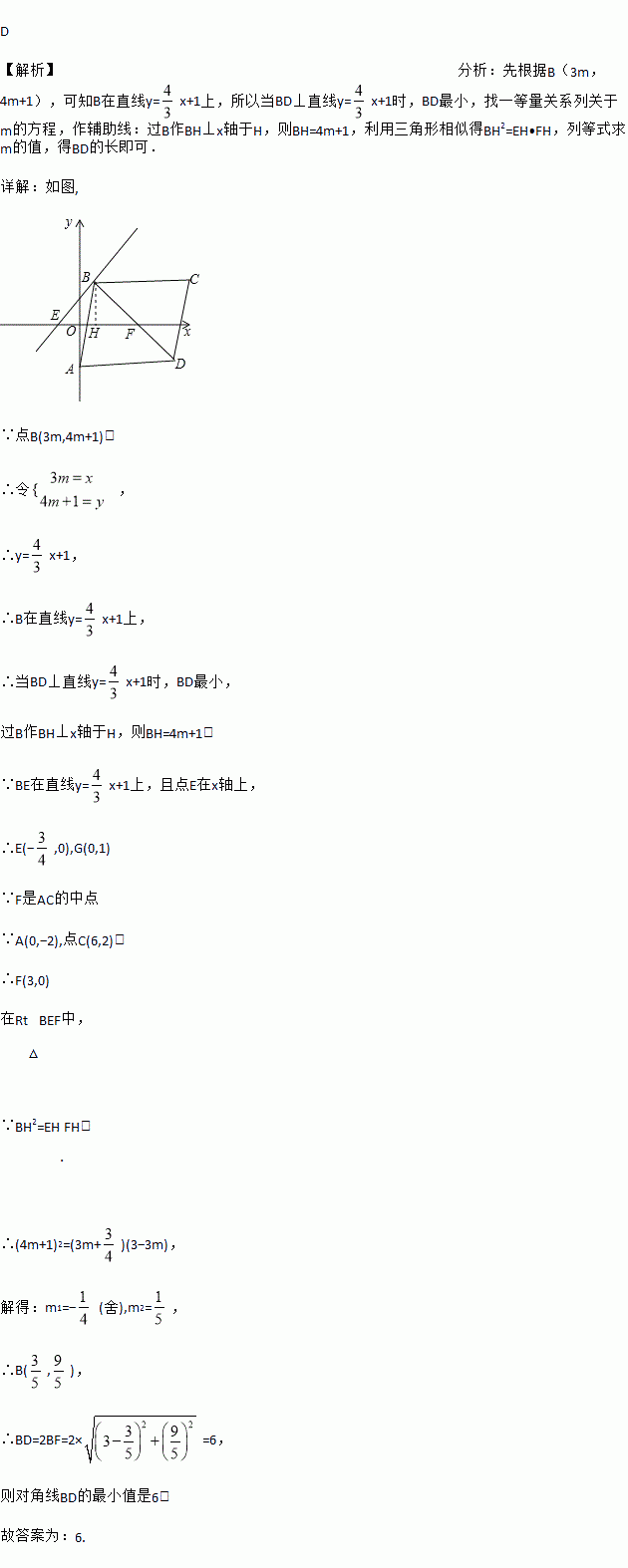 在平面直角坐标系中,已知平行四边形ABCD的点A(0,﹣2)、点B(3m,4m+1)(m≠﹣1),点C(6,2),则对角线BD的最小值是( )