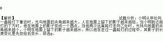 B 【解析】试题分析:小明从甲处向一盏路灯下靠近时,光与地面的夹角越来越大,人在地面上留下的影子越来越短,当小明到达路灯的下方时,他在地面上的影子变成一个圆点,当他再次远离路灯走向乙处时,光线与地面的夹角越来越小,小明在地面上留下的影子越来越长,所以他在走过一盏路灯的过程中,其影子的长度变化是先变短后变长.故选B.