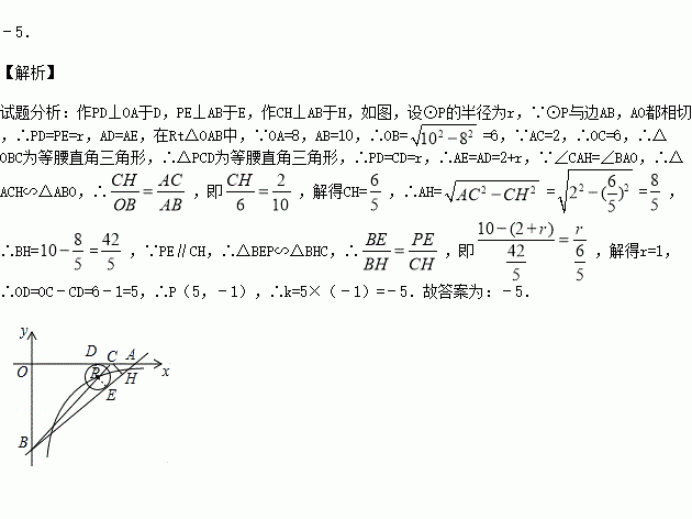 (3分)如图,OA在x轴上,OB在y轴上,OA=8,AB=10,点C在边OA上,AC=2,⊙P的圆心P在线段BC上,且⊙P与边AB,AO都相切.若反比例函数()的图象经过圆心P,则k= .
