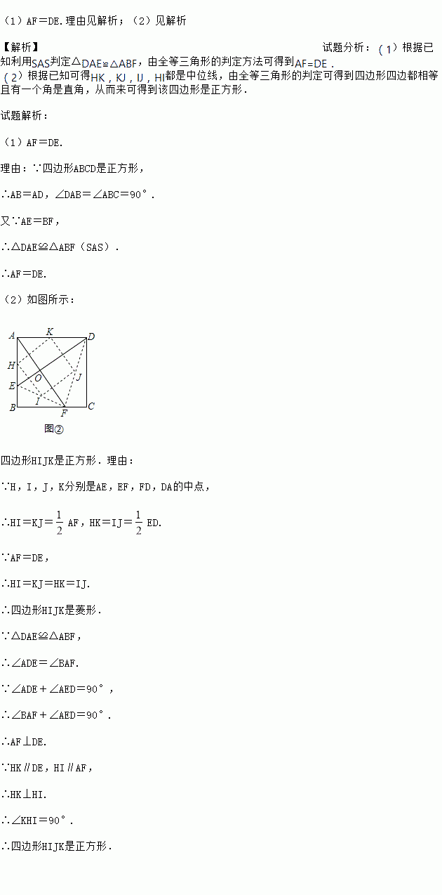 (2)连接EF,DF,分别取AE,EF,FD,DA的中点H,I,J,K,则四边形HIJK是什么特殊四边形?请在图2中补全图形,并说明理由.