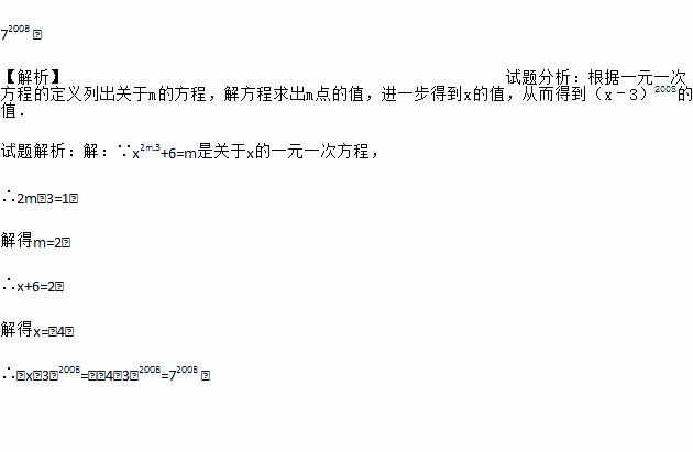 72008 . 【解析】试题分析:根据一元一次方程的定义列出关于m的方程,解方程求出m点的值,进一步得到x的值,从而得到(x﹣3)2008的值. 试题解析:【解析】 ∵x2m﹣3+6=m是关于x的一元一次方程, ∴2m﹣3=1, 解得m=2, ∴x+6=2, 解得x=﹣4, ∴(x﹣3)2008=(﹣4﹣3)2008=72008 .