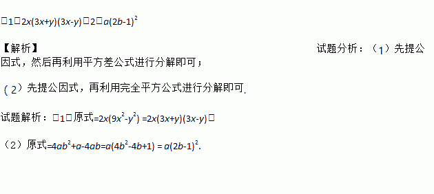 (1)2x(3x+y)(3x-y)(2)a(2b-1)2 【解析】试题分析:(1)先提公因式,然后再利用平方差公式进行分解即可; (2)先提公因式,再利用完全平方公式进行分解即可. 试题解析:(1)原式=2x(9x2-y2) =2x(3x+y)(3x-y); (2)原式=4ab2+a-4ab=a(4b2-4b+1) = a(2b-1)2.
