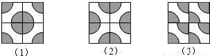 如图(1)所示,是一块边长为2的正方形瓷砖,其中瓷砖的阴影部分是半径为1的扇形.请你用这种瓷砖拼出两种不同的图案.使拼成的图案既是轴对称图形又是中心对称图形,并把它们分别画在下面边长为4的正方形(2)(3)中(要求用圆规画图).