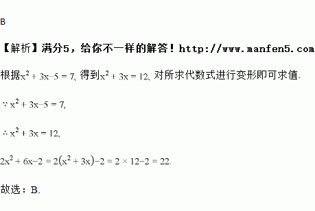 若x2+3x﹣5的值为7,则2x2+6x﹣2的值为( )