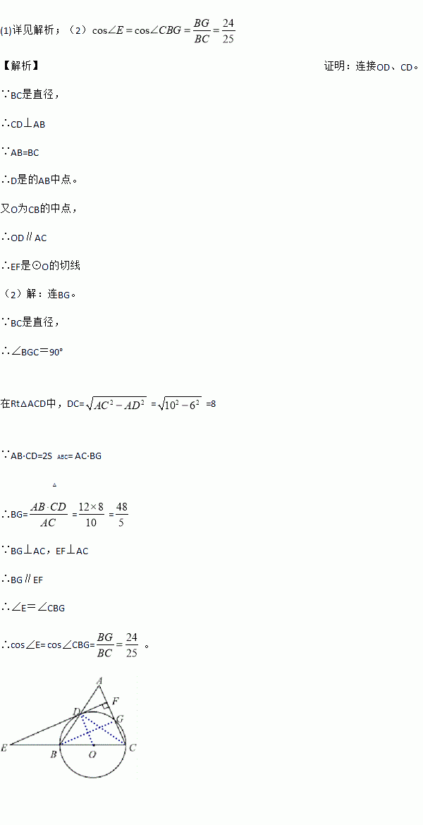 如图,等腰三角形ABC中,AC=BC=10,AB=12,以BC为直径作⊙O交AB于点D,交AC于点G,DF⊥AC,垂足为F,交CB的延长线于点E.