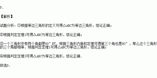 ②若∠A=∠B=∠C,则△ABC为等边三角形;