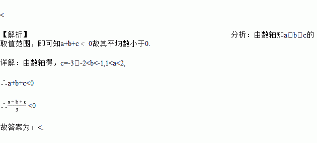 已知三个数在数轴上表示的位置如图所示,则这三个数的平均数____0.(填“、= 或”)