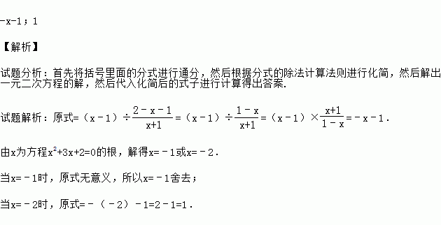 先化简,再求值:(x﹣1)÷(﹣1),其中x为方程x2+3x+2=0的根.