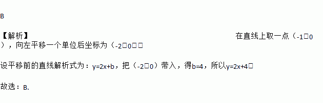 B 【解析】在直线上取一点(-1,0),向左平移一个单位后坐标为(-2,0), 设平移前的直线解析式为:y=2x+b,把(-2,0)带入,得b=4,所以y=2x+4, 故选:B.