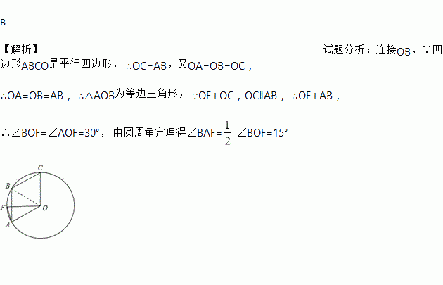 如图,点A、B、C是⊙O上的三点,且四边形ABCO是平行四边形,OF⊥OC交圆O于点F,则∠BAF等于( )
