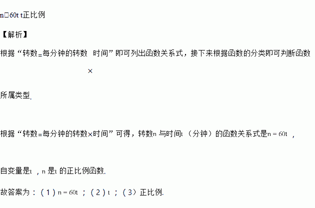 轮子每分钟转60转,则轮子的转数n与时间t(分)之间的关系式为_______,自变量是_______,n是t的_______函数.