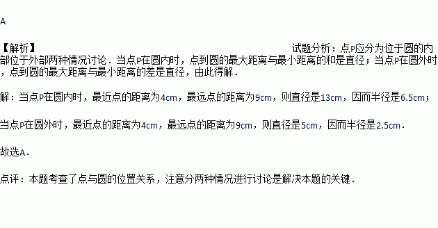 若一个点到圆的最小距离为4cm,最大距离为9cm,则该圆的半径是( )