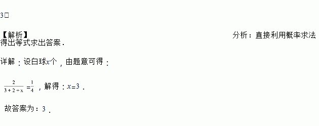 在一个不透明的袋子中,装有大小,形状,质地都相同,但颜色不同的红球3个,黄球2个,白球若干个,从袋子中随机摸出一个小球是黄球的概率是,则袋子中白色小球有_____个;