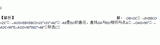 如图,AB是⊙O的直径,直线DA与⊙O相切于点A,DO交⊙O于点C,连接BC,若∠ABC=21°,则∠ADC的度数为( )