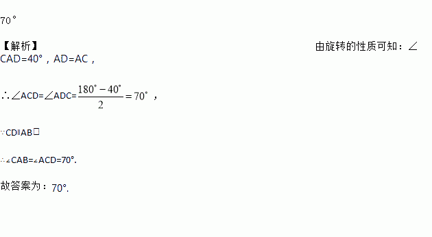 如图,在同一平面内,将△ABC绕点A逆时针旋转40°到△AED的位置,恰好使得DC∥AB,则∠CAB的大小为______________.