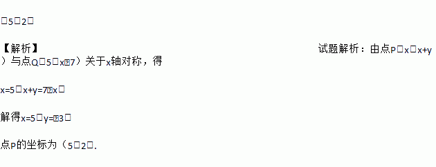 (5,2) 【解析】试题解析:由点P(x,x+y)与点Q(5,x﹣7)关于x轴对称,得 x=5,x+y=7﹣x. 解得x=5,y=﹣3, 点P的坐标为(5,2).