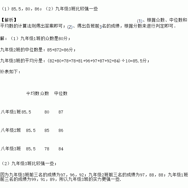为提高学生的爱国意识,陶冶爱国情操,某中学举行了以“厉害了,我的国”为主题的书法绘画大赛,该校九年级共有三个班都参加了这次活动,三个班根据初赛成绩分别选出了10名同学参加决赛,这些选手的决赛成绩(满分100分)如下表所示: