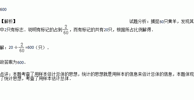 某地区为估计该地区黄羊的只数,先捕捉20只黄羊给它们分别作上标志,然后放回,待有标志的黄羊完全混合于黄羊群后,第二次捕捉40只黄羊,发现其中两只有标志。从而估计该地区有黄羊______.