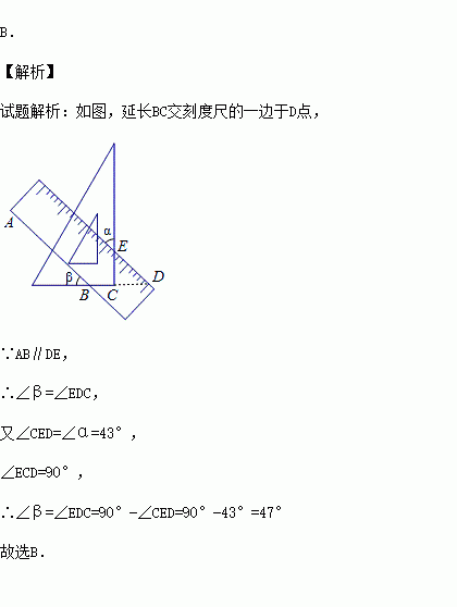将一个直角三角板和一把直尺如图放置,如果∠α=43°,则∠β的度数是( )