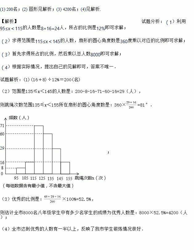 (3)若本次抽查中,跳绳次数在125次以上(含125次)为优秀,请你估计全市8000名八年级学生中有多少名学生的成绩为优秀;