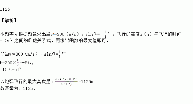 炮弹从炮口射出后,飞行的高度与飞行的时间之间的函数关系是,其中是炮弹发射的初速度,是炮弹的发射角,当,时,炮弹飞行的最大高度是________.