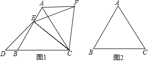 (1) 如图1,点E在线段AB上,点D在射线CB上,且ED=EC,将△BCE绕点C顺时针旋转60°至△ACF,连接EF,猜想线段AB、DB、AF之间的数量关系
