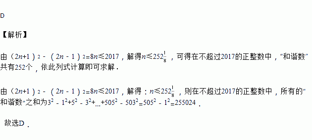 如果一个正整数可以表示为两个连续奇数的平方差,那么称该正整数为“和谐数”如(8=32﹣12,16=52﹣32,即8,16均为“和谐数”),在不超过2017的正整数中,所有的“和谐数”之和为( )