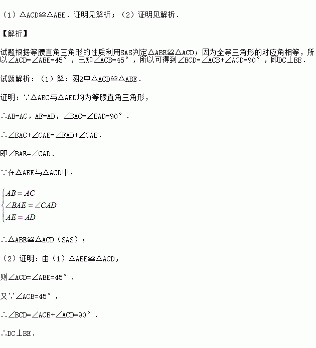 两个大小不同的等腰直角三角形三角板按图1所示的位置放置,图2是由它抽象出的几何图形,AB=AC,AE=AD,∠BAC=∠EAD=90°,B,C,E在同一条直线上,连接DC.