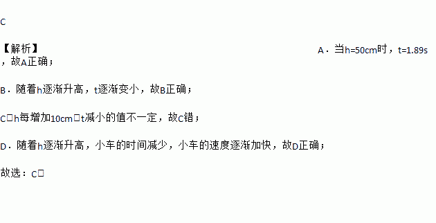 C 【解析】A.当h=50cm时,t=1.89s,故A正确; B.随着h逐渐升高,t逐渐变小,故B正确; C.h每增加10cm,t减小的值不一定,故C错; D.随着h逐渐升高,小车的时间减少,小车的速度逐渐加快,故D正确; 故选:C.