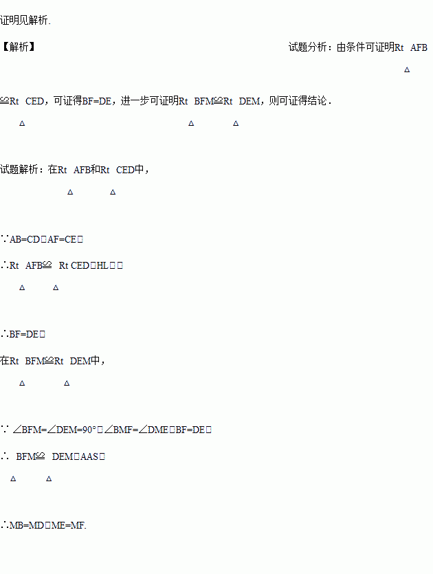 如图,E、F分别为线段AC上的两个点,且DE⊥AC于E,BF⊥AC于F,若AB=CD,AF=CE,BD交AC于点M.