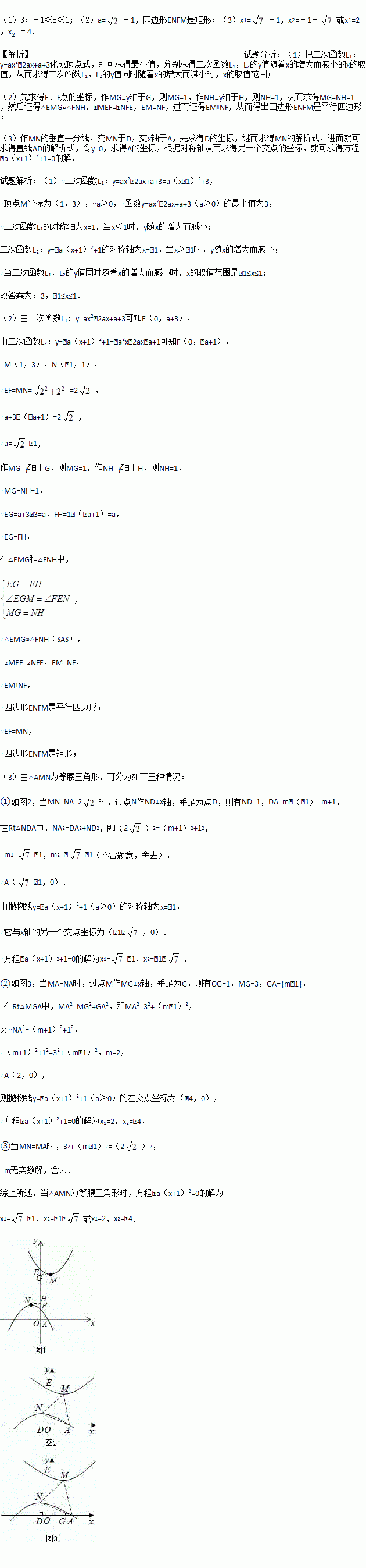 (3)若二次函数L2的图象与x轴的右交点为A(m,0),当△AMN为等腰三角形时,求方程﹣a(x+1)2+1=0的解.