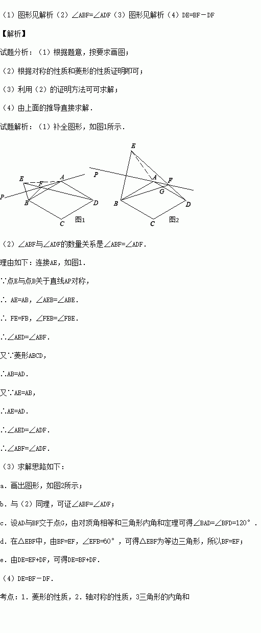 在菱形ABCD中,∠BAD=120°,射线AP位于该菱形外侧,点B关于直线AP的对称点为E,连接BE、DE,直线DE与直线AP交于F,连接BF,设∠PAB=