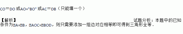 如图,已知线段AB、CD相交于点O,且∠A=∠B,只需补充一个条件_________,则有△AOC≌△BOD。