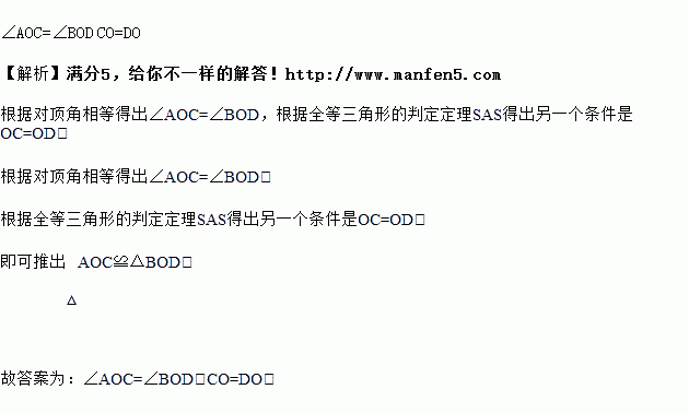 如图,AB、CD相交于O,且AO=OB观察图形,图中已具备的另一个相等的条件是_____,联想“SAS”,只需补充条件_____,则有△AOC≌△BOD.
