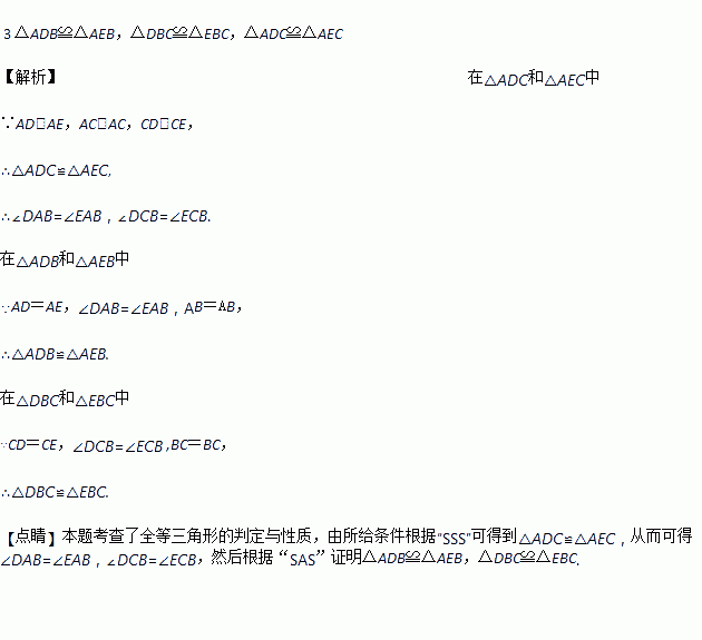 如图,点C在线段AB的延长线上,AD=AE,BD=BE,CD=CE,则图中共有_____对全等三角形,它们分别是__________________________.