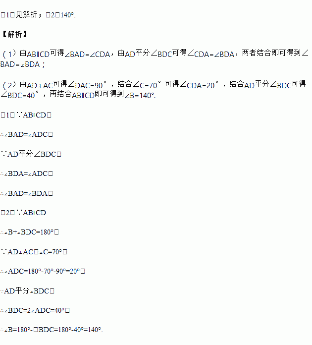 (2)若AD⊥AC,∠C=700,求∠B的度数.