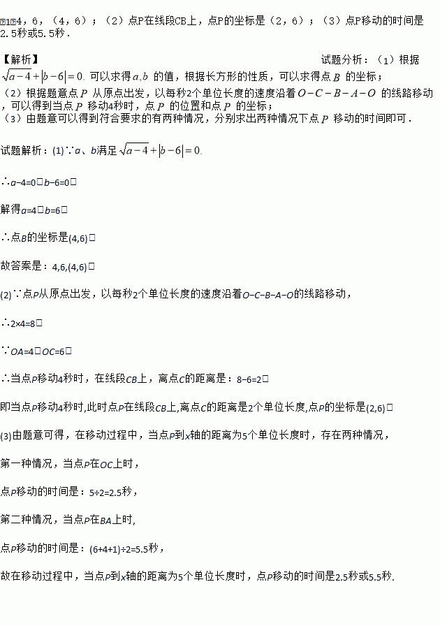 +|b﹣6|=0,点B在第一象限内,点P从原点出发,以每秒2个单位长度的速度沿着O﹣C﹣B﹣A﹣O的线路移动.