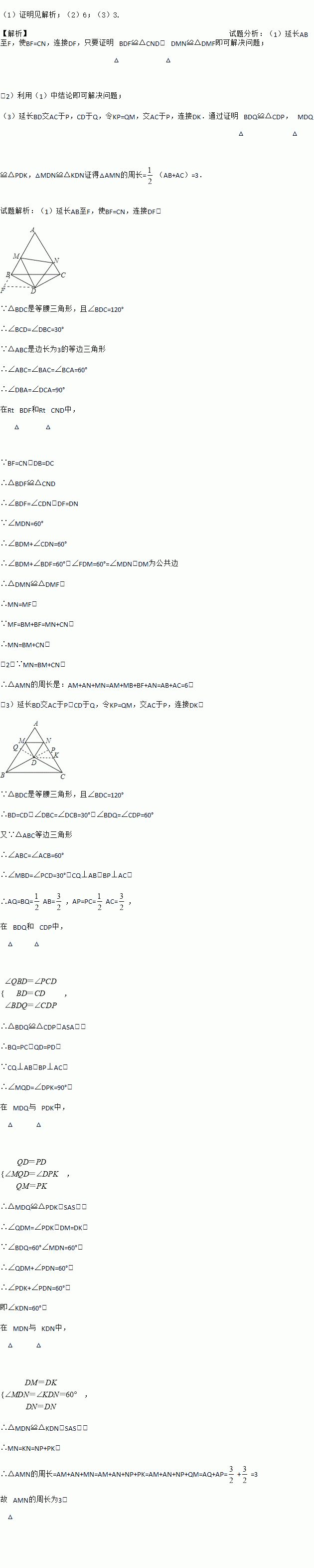 已知:△ABC是边长为3的等边三角形,以BC为底边作一个顶角为120º等腰△BDC.点M、点N分别是AB边与AC边上的点,并且满足∠MDN=60º.
