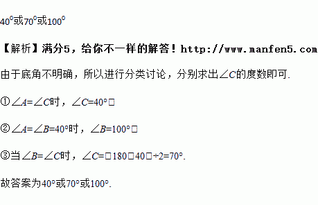 在△ABC中,∠A=400 ,当∠C=____时,△ABC为等腰三角形.