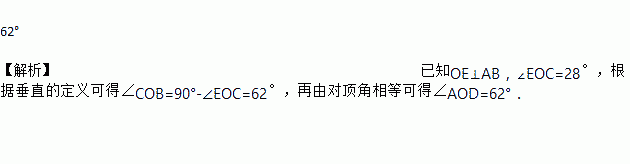 如图,已知AB、CD相交于点O,OE⊥AB,∠EOC=28°,则∠AOD=______度.